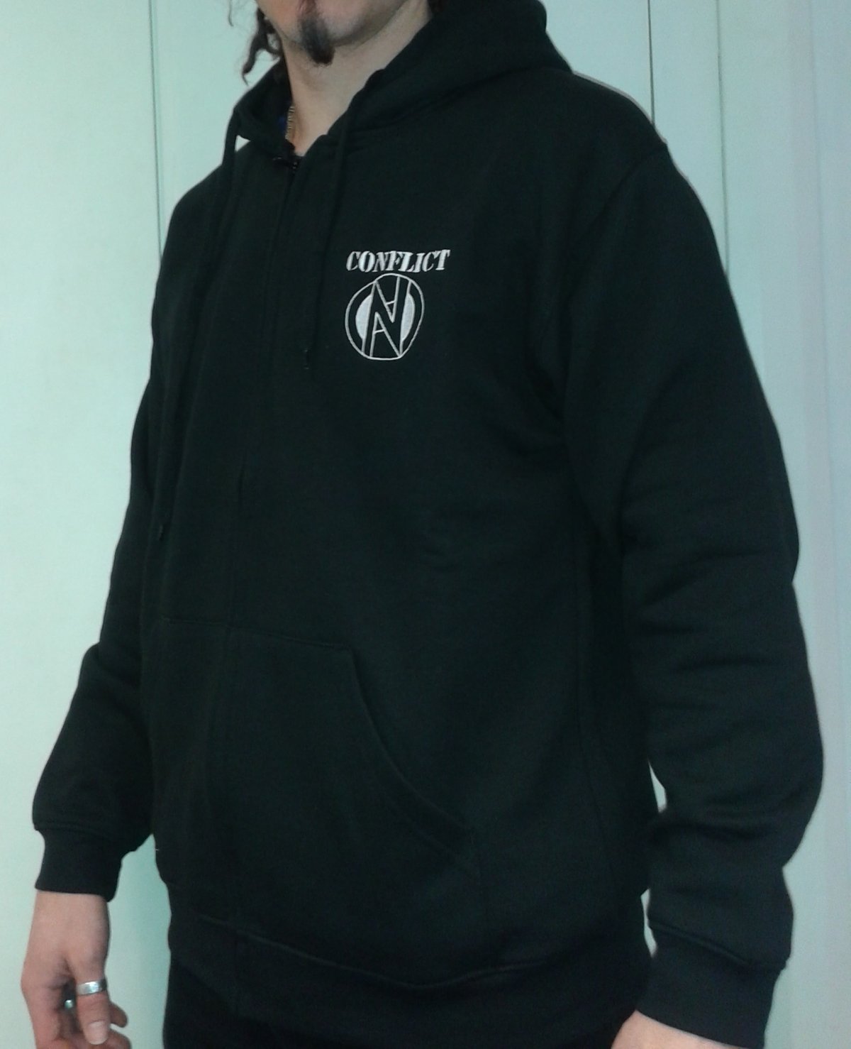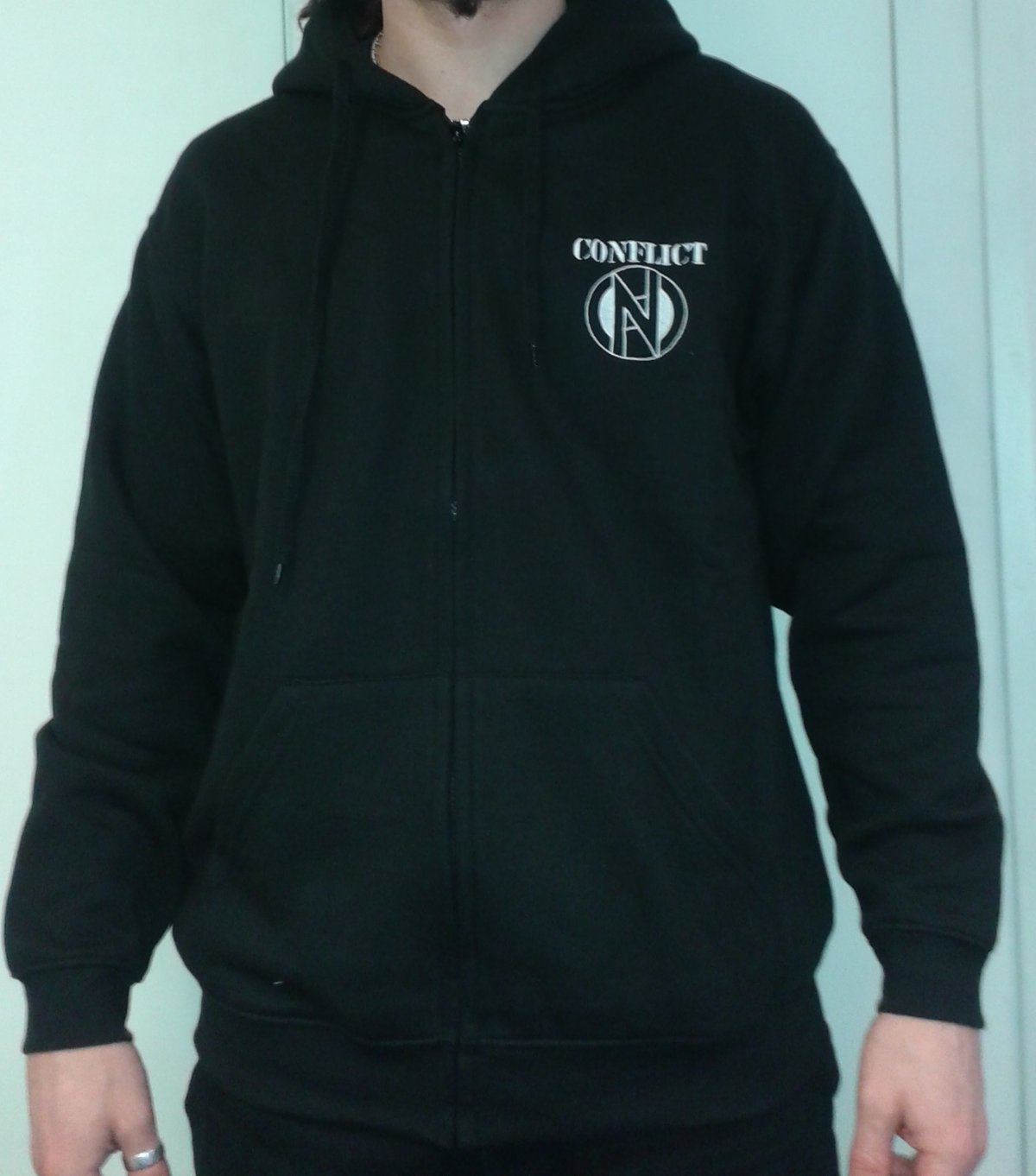Great quality Uneek zip-up hoodie with the Conflict/Mortarhate logo embroidered on the left breast.